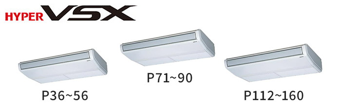 三菱重工の天吊形は、P50、P56タイプを従来の中母形ユニットから小母形ユニットへ変更してコンパクト化を図りました。また、P63~P160タイプに搭載のファンモータを従来の2個から1個に変更して軽量化を図りました。