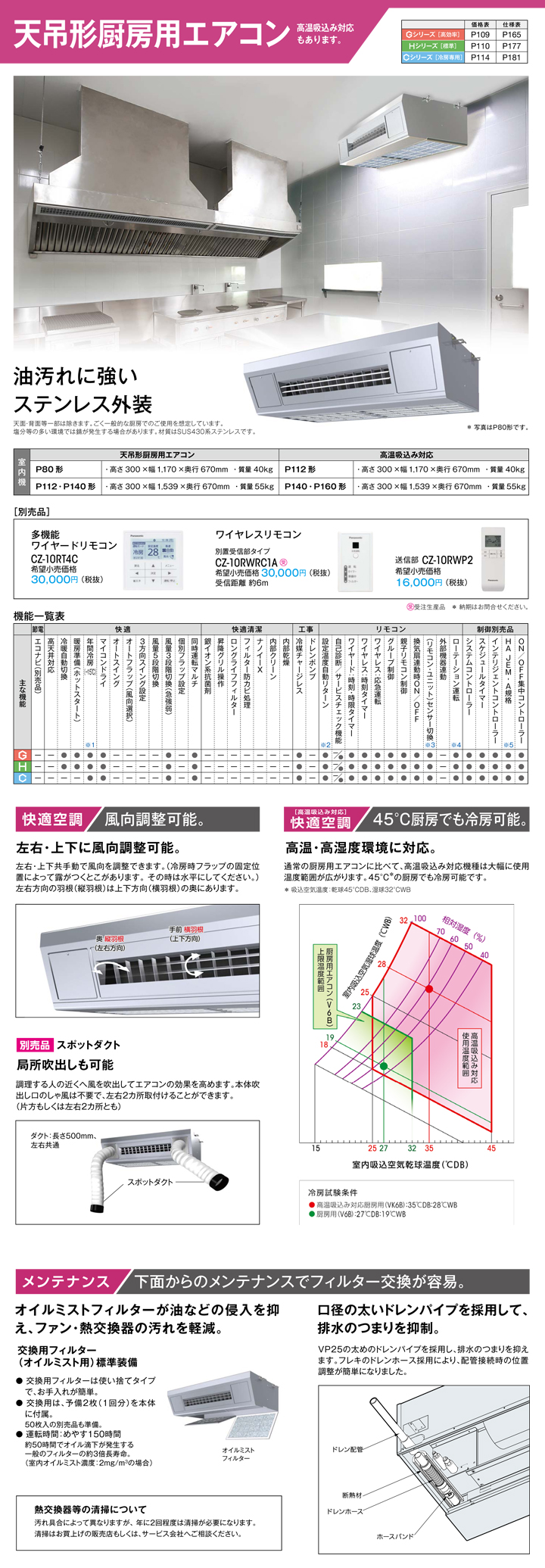 左右・上下に手動で風向を調節出来ます。(冷房時フラップ固定位置によって露がつくこともありますので、その際は水平にしてください。)別売品のスポットダクト(長さ500㎜)を付けることで局所吹出しも可能です。調理をする人の近くへ風を吹出してエアコン効果を高める働きがあります。左右2か所に取付けられます。