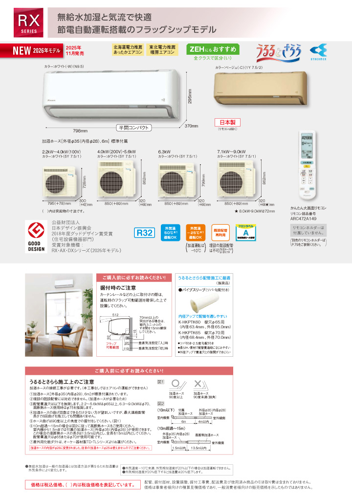 ダイキンの壁掛形は、全機種、左右、後、下からの配管取出しが可能で施工性に優れています。またドレンアップキット(別売)も取付可能です。