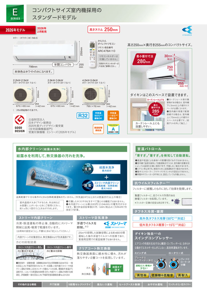| セット内容 | 室内機:F286ATES-W x 1 室外機:R286AES x 1 リモコン:ARC478A110 x 1 |