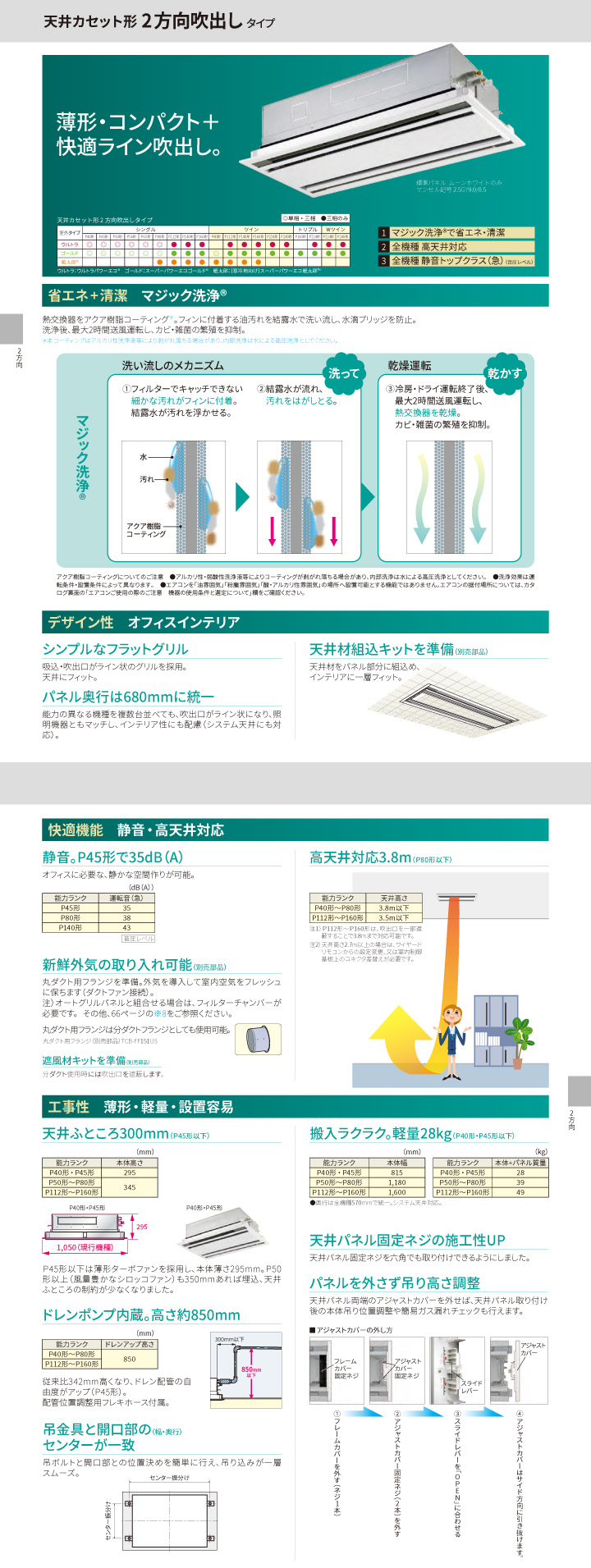 東芝業務用エアコンは、静音設計、P45形で35db(A)を実現、オフィスに必要な静かな空間作りが可能です。また別売の丸ダクト用フランジを準備、外気を導入して(20%以下)室内空気をフレッシュに保ちます(ダクトファン接続、分ダクトフランジとしても使用可能)遮風材キット(別売)も準備、分ダクト使用時には吹出口を遮蔽します。注)オートグリルパネルと組み合わせる場合は、別途フィルターチャンバーが必要です。