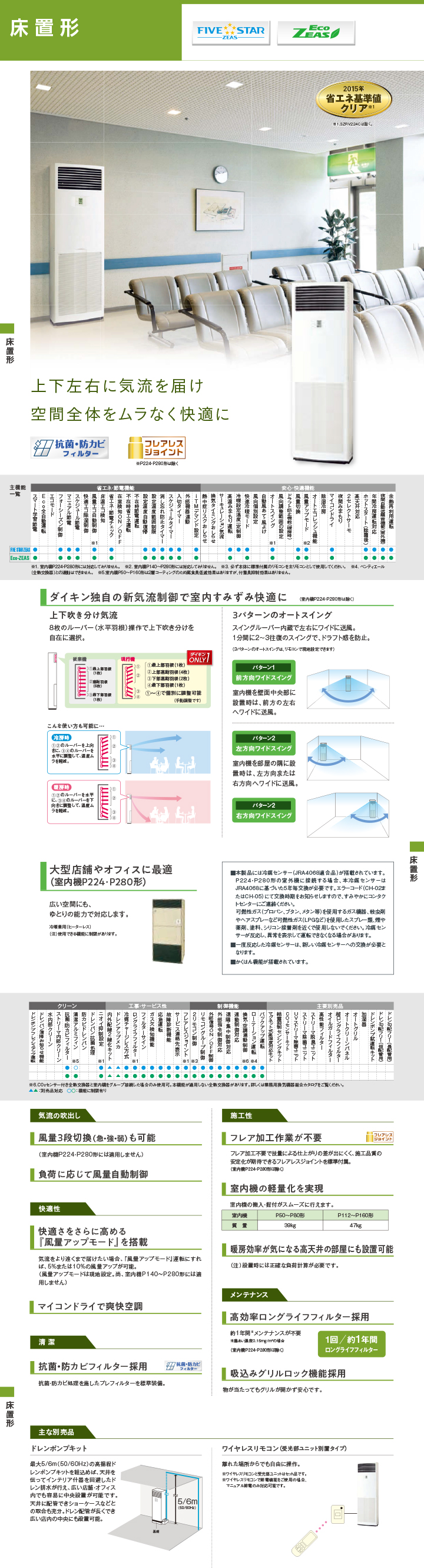 ダイキンの床置形は、風量3段階切換(急・強・弱)も選択可能です。さらに、負荷に応じて風量自動制御します。